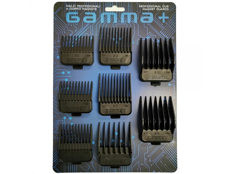 Professional complete set of double Neodymium magnetic guards. Easy, fast and safe secure guards Premium quality. Compatible with all Gamma+ clippers and most other professional brands