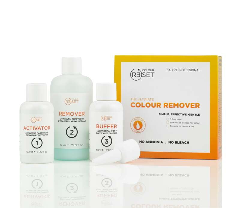 Colour Reset reverses the hair colouring process. A permanent hair colour works by depositing small artificial pigment molecules inside the hair. If you think of hair as a swimming pool, imagine those artificial pigment molecules as hundreds of marbles. All permanent hair colour requires hydrogen peroxide to create a permanent result. Peroxide causes something called 'oxidation' meaning the hydrogen peroxide 'oxidises' when the air hits it. This causes the artificial hair molecules (marbles) to expand (to the size of colourful footballs) and become trapped inside the hair (swimming pool). Because those colour molecules have expanded they simply cannot be washed from the hair – no matter how hard you try – they are trapped and permanent. Colour Reset works by reversing the colour process. When mixed and applied to the hair, parts 1 and 2 of Colour Reset are able to shrink those big (football) artificial hair colour molecules back to their original (marble) size, enabling them to be rinsed away. Colour Reset shrinks the artificial colour molecules and washes them from the hair, revealing the lightest, previous shade. This shade may be lighter than the natural colour, as bleach and ammonia from previous colour treatments may have lightened the natural pigment.